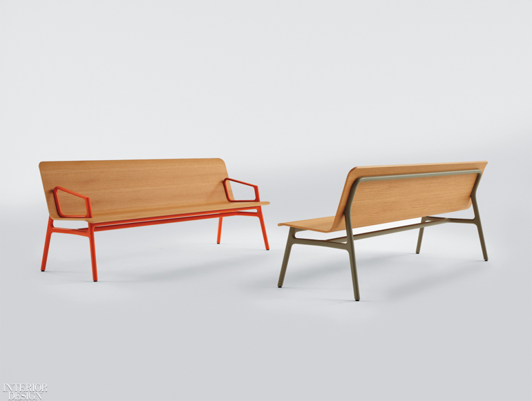 鹤立鸡群:可持续性和模块化特征层创始人的细长y形框架长凳,精心制作的回收铝和胶合板。