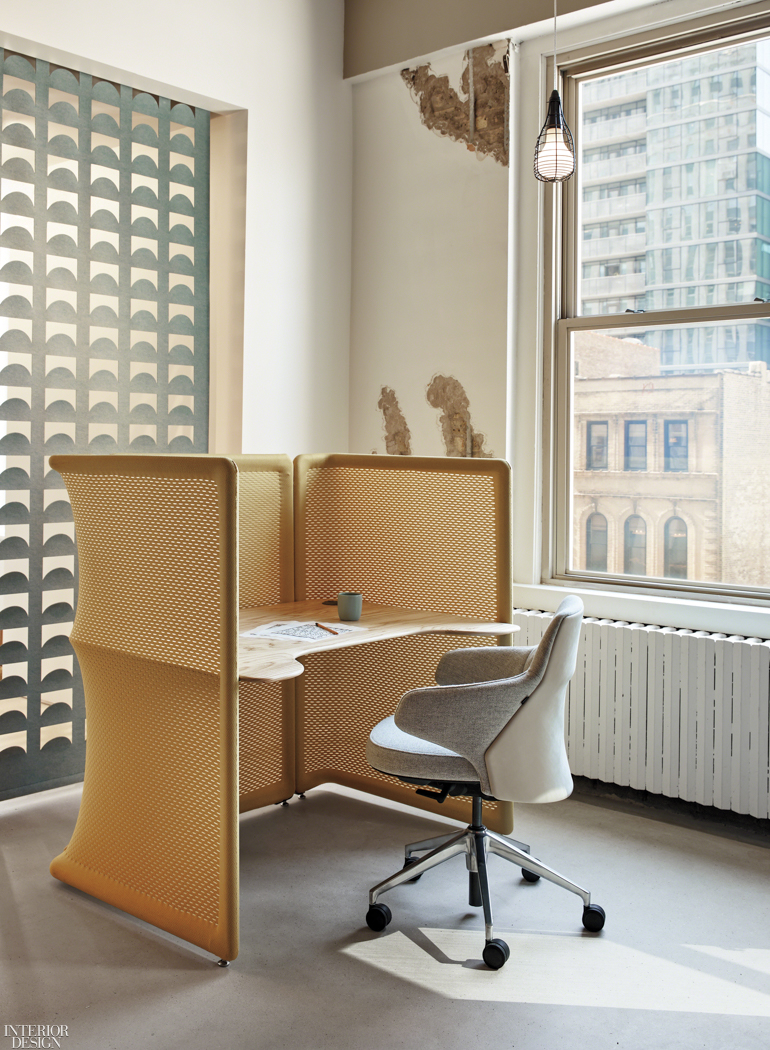 鹤立鸡群:编织隐私屏幕是这款小巧的“聚焦角落”的标志,它集成了电源和电线管理,是这位法国设计师对工作场所分心的优雅回应。