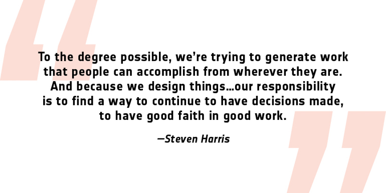 SH:我们不能同时在彼此附近的同时变焦。但是我们最受关注的主要担忧主要是与我们依赖的人,所有承包商和供应商都显得非常巨大风险。尽可能多,我们试图生成人们可以从任何地方实现的工作。而且因为我们设计了事物,实际上没有做出任何事情,我们的责任是找到一种方法来继续做出决定,善于善良的工作。现在是时候了,因为他们需要工作,他们需要钱。我们确实有了一点练习:因为在9月11日的房间街上的办公室在红区,我们不允许恢复大约六周。那么惊人的是,我们在他们的办公室里有很多建筑师朋友借着我们的办公桌,所以我们将所有人都在其他人的空间内定位了人们。