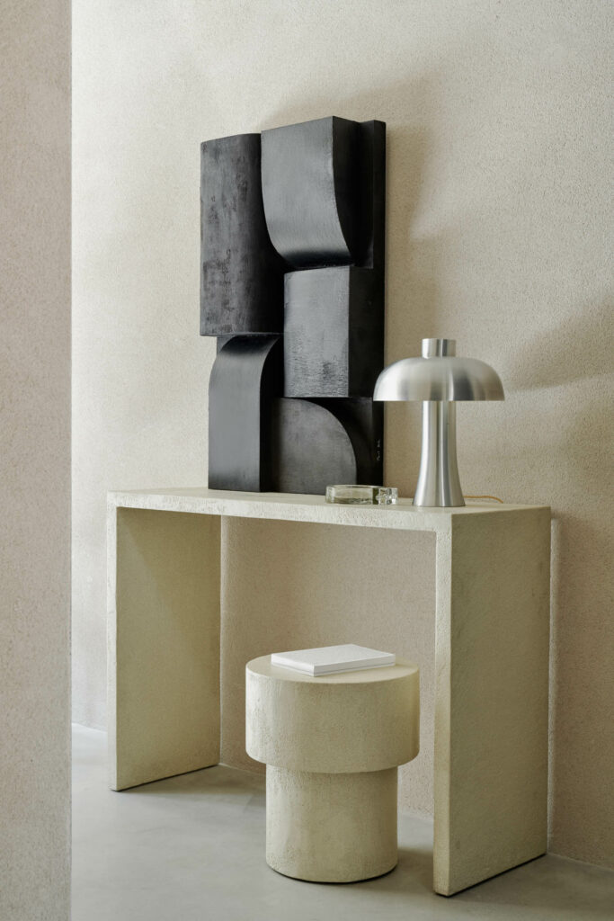 简单软化形状从微水泥中获取有机石形纹理,每块手工完成并独有离白咖啡桌、蘑菇形侧台和机台超出视觉吸引力-也易清理