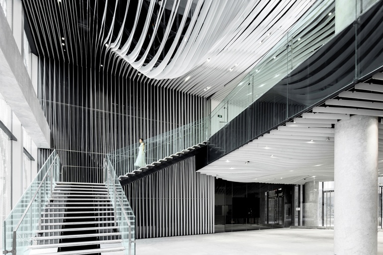 这座多功能建筑的大堂延续了从城市繁忙中解脱出来的主题,尽管这里的灵感从时尚转向了自然,特别是波纹。由薄而有弹性的薄板制成的百叶窗铝型材,粉底白色,纵横起伏天花板和墙壁。另一面墙是浅灰色大理石,纹理与波浪图案相呼应。大理石的表面是经过磨光而不是抛光的他解释道。小心翼翼地外面青翠的广场的框景完成了治疗效果。