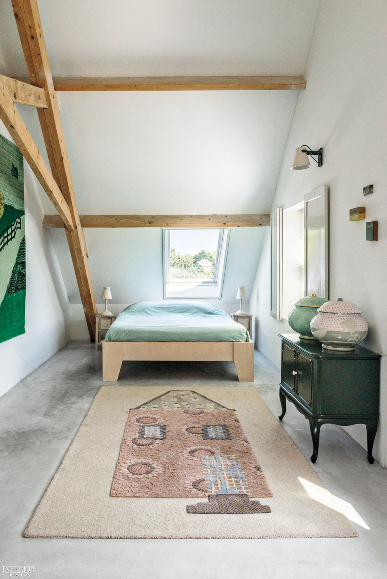 The master bedroom has many pieces by van Eijk, including her wool-and-viscose Townhouse rug for Nodus on the floor, Knick Knack ceramic pots on the dresser, Soft Table Shade ceramic lamps on the nightstands, and Memories of a Panorama textile hanging on the wall. Photography by Valentina Sommariva/Living Inside; production: Alice Ida Salerni.