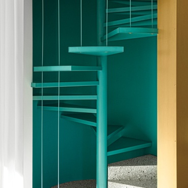 以楼梯为例,它可能是一个简单的连接点。Mindel把它的一面变成了一个三层楼高的雕塑屏风,由不同大小的穿孔块组成。这个结构看起来像石膏,但实际上是上漆的中密度纤维板;由布鲁克林海军造船厂制造商原位制造,它让人想起Erwin hau或者建筑师José Luis Sert的遮阳板。楼梯的另一侧覆盖着淡蓝色漆镶板,嵌有橡木栏杆,而在橡木踏板上则有绿色的羊毛滑轨。Mindel将整个构图比作一棵从草丛中升起的树,屏幕上的孔洞让斑纹的光线进入,就像真正的树的叶子一样。蓝色镶板在公寓的其他地方也出现了,包括主卧,它包围了更衣室,并在床上形成了一种顶篷。