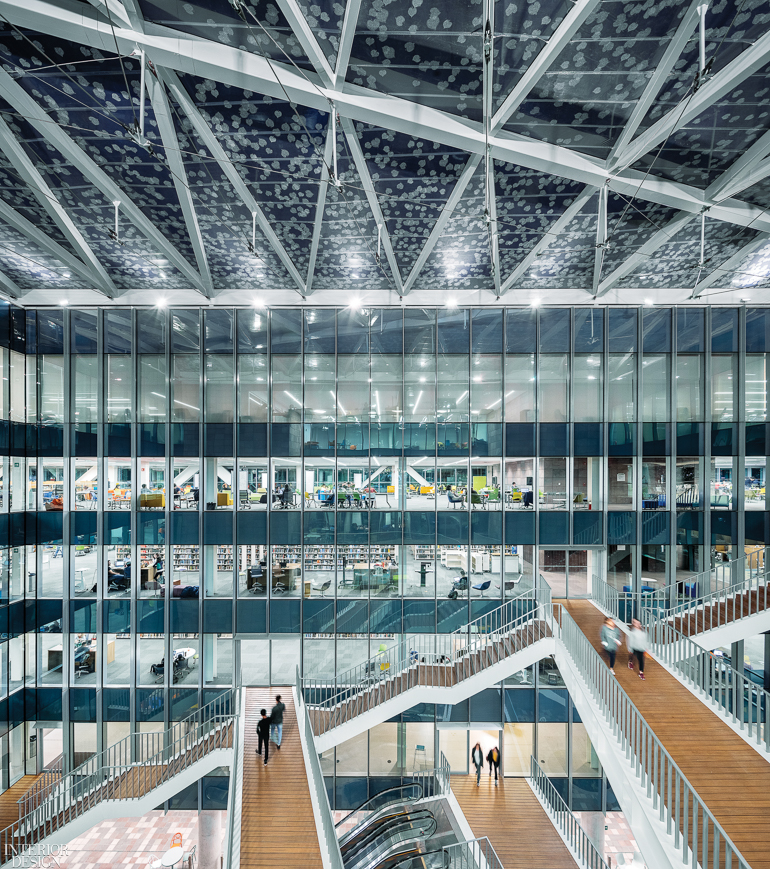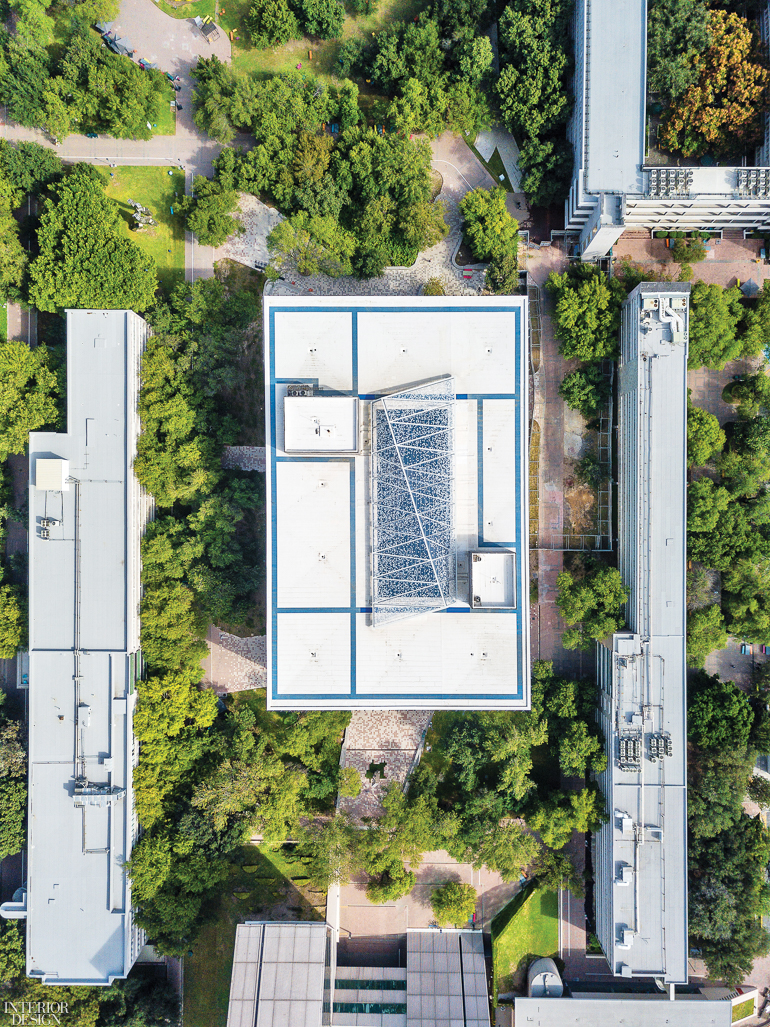 在墨西哥学院Tecnológico y de Estudios Superiores de Monterrey,普利多的母校FGP工作室创始人为主图书馆设计了一个7000平方英尺的天窗。经过17个月的规划和5个月的施工,由Francisco Gonzalez-Pulido领导的21名建筑师、工程师和建筑商完成了这个设计,它看起来就像超大天窗上的落叶。