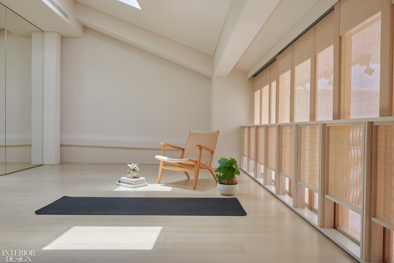 二楼的瑜伽工作室以木制框架的藤条屏风为特色,它作为分隔物包围了工作室,在吸引自然光的同时保护隐私。摄影的等设计办公室.