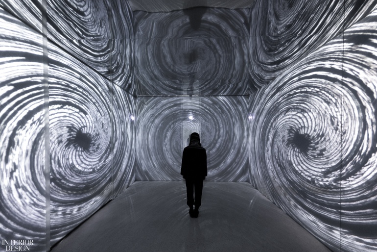 “情感转换器”,一种介于外部世界和内部信息丰富的环境之间的转换。抵达的游客站在一个大盒子里,盒子上有电致变色玻璃墙,上面投射着耀眼的灯光秀,生动的画面唤起了当今世界科技驱动的奇迹。作为虚拟的
