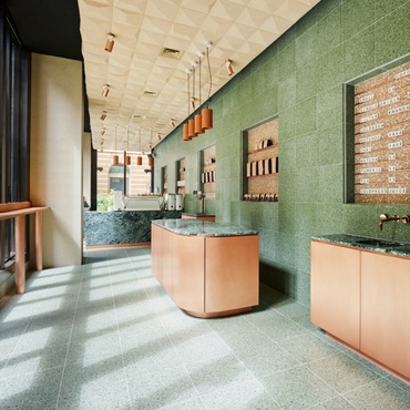 石膏 - 石膏墙,天花板和柱子涂在饱和色调中,除了闪亮的瓷器或外壳 - 水泥地板瓦片外,将纹理较少。备用现代化休息室家具包括粉红色,绿色或黄色乙烯基的明亮红咖啡馆和圆形或方形Ottomans。效果是大多数地区出现几乎是平坦的,看起来更像是一个Perky Photo-Booth的背景,而不是21,500平方英尺的电影。只有各个剧院都是多维的,带有拱形的LED点亮凹槽,绿松石座椅和定制画布墙壁覆盖物。“我们将一张照片打印到画布上,给它一个葡萄酒纹理,”后者的Nguyen Notes。在橙色和绿色的朴实的色调中,剧院是旧西贡的情绪化。