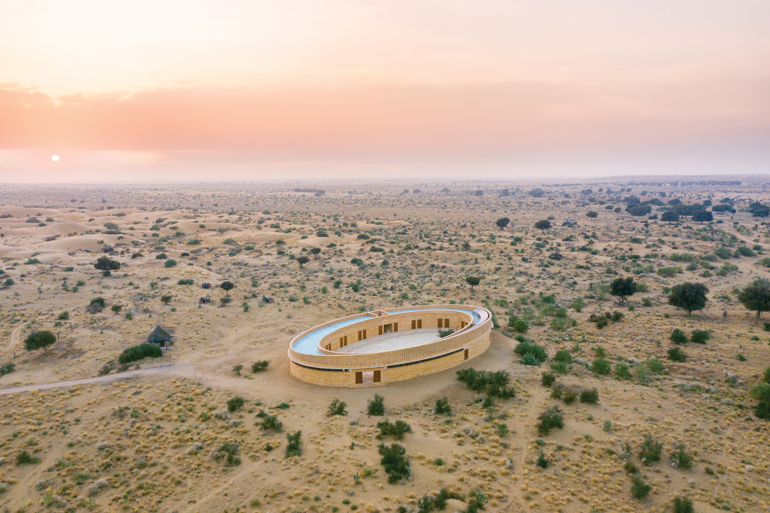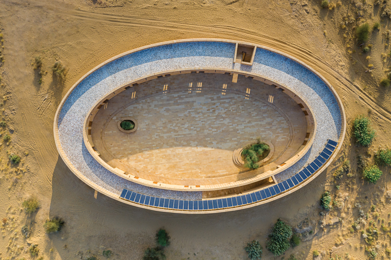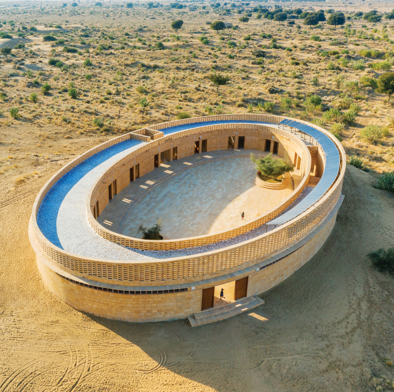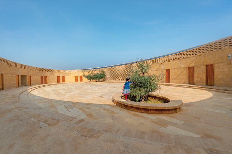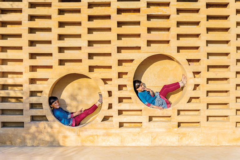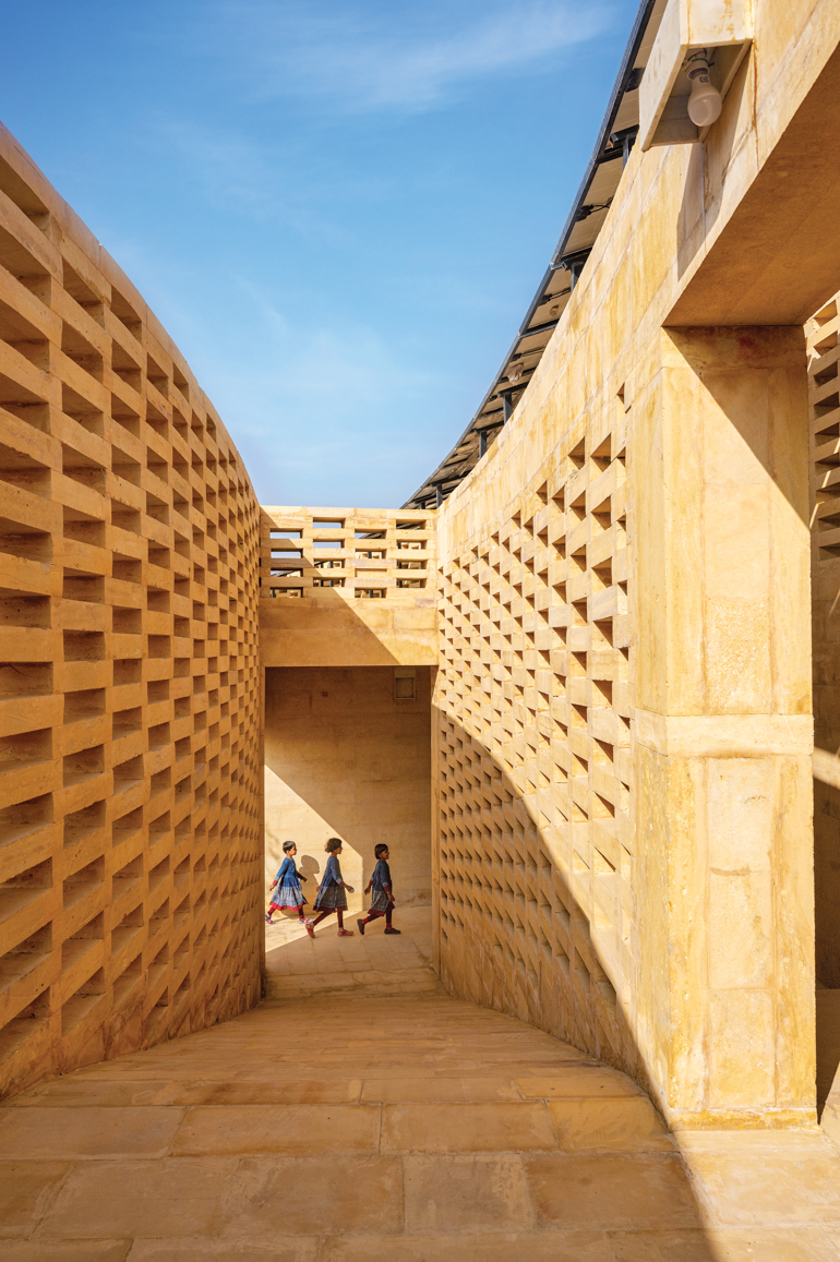建筑师开始学习,因为她对该地区,参观学校和会议家庭来说。“你必须倾听社区,或者他们不会送他们的女孩,”她说。“我试图找出什么会让女孩们感到安全舒适,以及与他们共鸣的结果。”绰号金城,斋沙默尔以其砂岩建筑而闻名,包括一个宏伟的12世纪堡垒,占据了景观。Kellogg特别被华丽的装饰雕刻袭击。“工匠像黄油一样对待石头,”她指出。“这就像一个观看的奇迹。”然而,石雕是一个垂死的艺术,年轻人倾向于作为另一个时代的遗物避免。“我们的目标是表明您可以以现代方式使用这种工艺和这些技术,”Kellogg说。她构思了一个椭圆形砂岩结构,展示了工匠的专业知识。 The oval is a symbol of female strength across cultures, while its curves evoke the ramparts of Jaisalmer Fort. “There are many curvilinear stone structures in the area,” Daube observes. “Diana kept that integrity but infused it with a crisp, contemporary feel.”