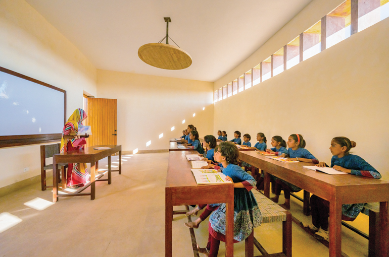 一大群工匠和日劳工在10个月内建造了8,890平方英尺的学校。在没有电力或重型机械的情况下工作,它们切割坚固的砂岩块并仅使用简单的水位对齐。里面,雕刻砂岩洗脸盆,柚木书桌,并编织挑拨座位用手局部地制作;几乎所有材料来自Jaisalmer。“我们涉及社区,所以他们会有一个股份并在建筑物中骄傲,”凯洛格解释道。“他们不想把女孩送到学校,但他们想把女孩送到这学校,因为他们有一只手。“Daube感觉到该架构,让人想起古代宫殿和堡垒,为整个项目和女孩们进行了。这个使命似乎说,将持续。
