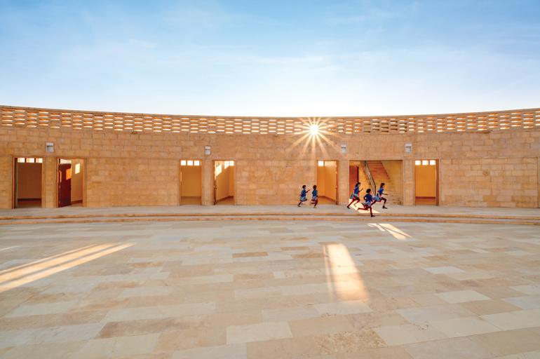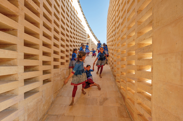 今年,许多来自Jaisalmer周围的农村地区,印度北部拉贾斯坦邦的一个城市,将首次上学。他们将穿上蓝色制服,并乘坐公共汽车到Rajkumari Ratnavati女子学校,在塔尔沙漠中的一个10教室结构。在一个女性婴儿和儿童婚姻令人震惊的地区,它甚至存在女孩的学校是显着的。然而,由美国非营利组织Citta(Sanskrit为意识)和设计的建筑物戴安娜凯洛格建筑师,超越其功能。它几乎完全由手工雕刻的砂岩块,它支持当地工匠 - 包括一些女孩的父亲 - 并证明遗产架构可以采取优雅的现代形式。