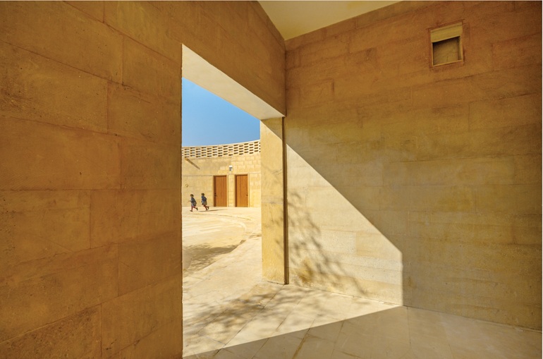 沙漠极端天气条件下的设计因素,温度范围为40至120度。像该地区的所有学校一样,它在一个庭院周围中心,凯洛格计划用大型风帆般的帆布遮荫。内壁上没有空调,但无源太阳能技术和石灰 - 石膏涂层有助于保持教室凉爽。扁平的镶嵌屋顶,筛选jali.-SyleyLatework Parapets提供交叉通风和防尘器的保护,提供许多目的:它可以是一个户外学习空间,在Breezy Day,表演阶段,或游乐区。金属框架支撑电源建筑物的太阳能电池板;Kellogg希望在结构下安装猴子吧和摇摆。继珍贵雨水的传统技术之后,屋顶也充当一个巨大的排水沟,其中落在院子里空洞,它本身将成为其中心地下蓄水池的集水区。