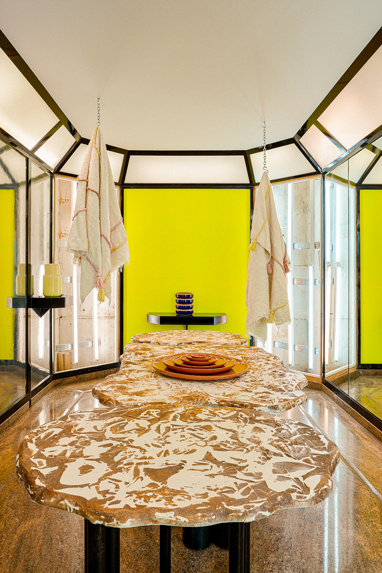 一种V.对Meknes和Onda Calabra的牡蛎-这前两个收藏品-分别是受到关节城市的启发。由设计师Maddalena Casadei,Maria Jeglinska和Julie Richoz的地毯,陶瓷和窗帘反映他们的时间学习技术的Meknes的当地工匠。“参与每个步骤创造了与物体的情感联系,”塔齐说。“我在那里携带粘土或用织布制作几节。”