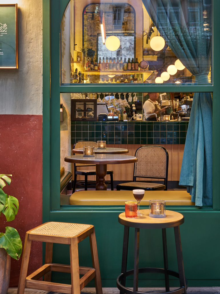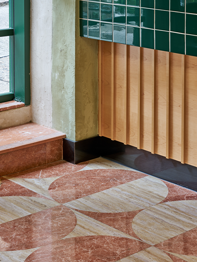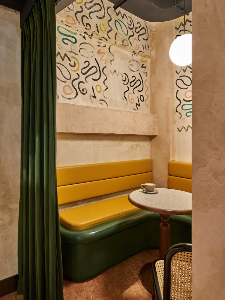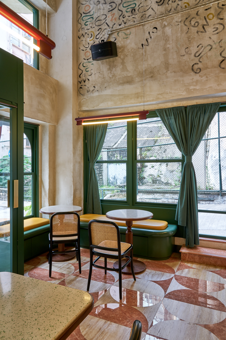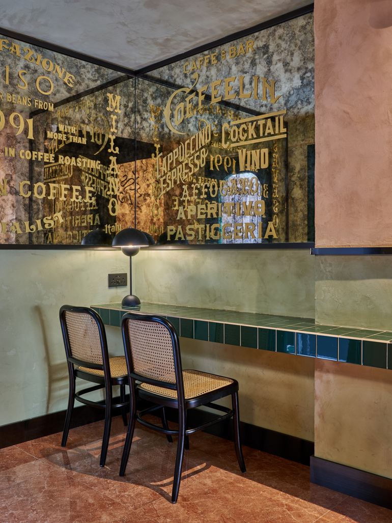 背景是商店的外观,漆成灰绿色,并以番茄红为主色调,以唤起意大利国旗的色彩。在内部,墙壁用意大利进口的威尼斯灰泥处理,达到乡村效果,优化了建筑原有的缺陷。室内和室外的墙壁都有一个有趣的孟菲斯风格的主题,既是对上世纪80年代米兰的致敬——据阿库纳说,那时候米兰成为了欧洲的设计之都——也是为了增加运动感,就像一杯咖啡上冒出的蒸汽。红色大理石和石灰华图案的半月形地板突出了意大利宫殿颓废风格的美学致敬。藤椅和定制的灯具将空间连接在一起,创造出舒适和现代的氛围,成功地将顾客带到数千英里之外的米兰中心。