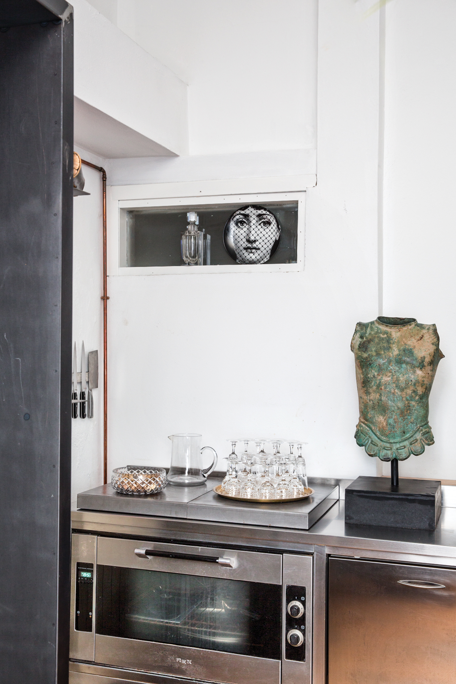 公寓内的新,旧和回收的意大利设计的进一步交叉口包括穆拉诺玻璃制成的灯具,如大号'70s venini枝形吊灯