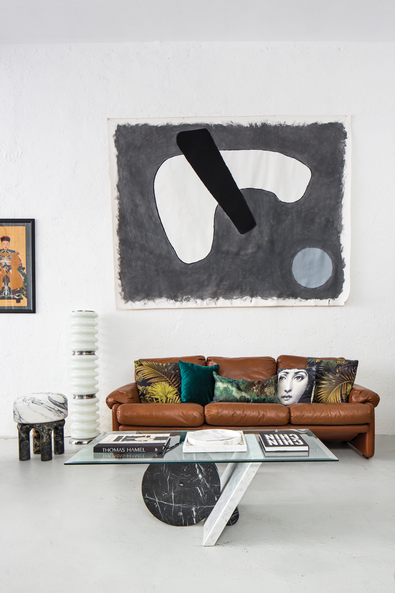 烟草皮革与扶手椅分享到扶手椅,从同一个十年中发现并在翡翠天鹅绒和他光滑的大理石美女凳中恢复。在墙壁上是一个'70s意大利梳妆镜和大抽象帆布