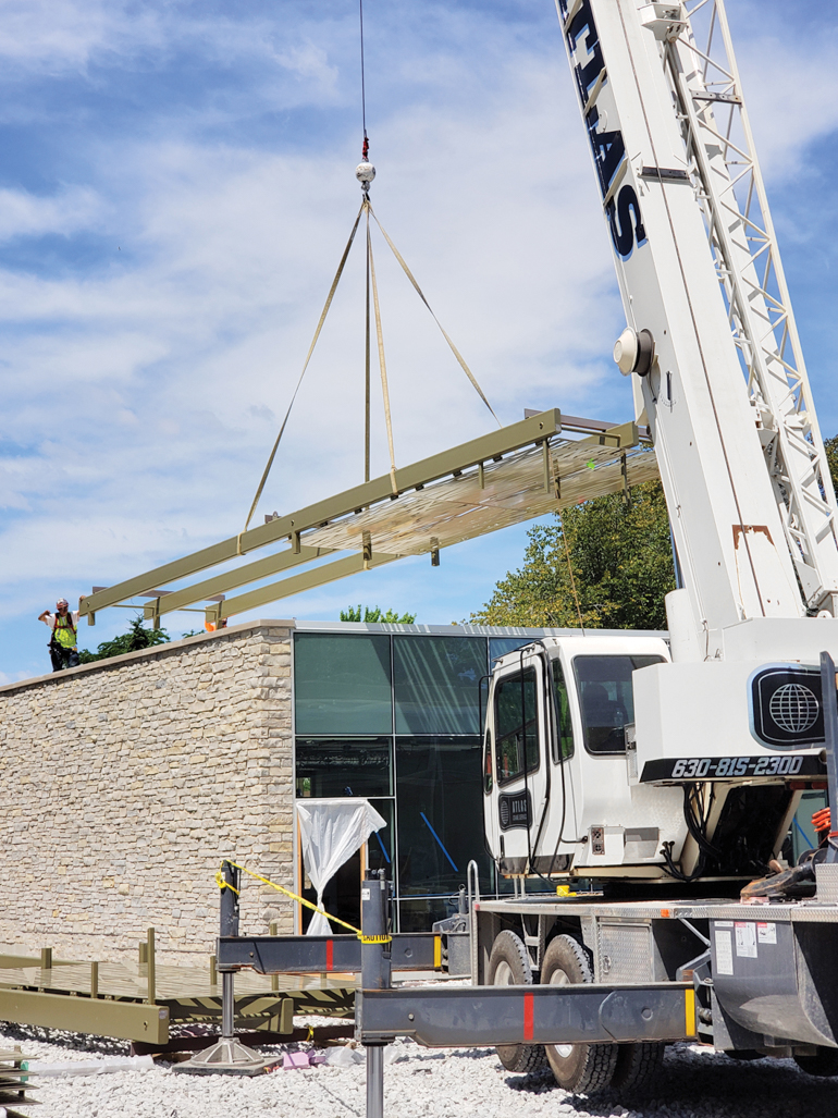现场,一名起重机安装了模块,该模块是预制的激光切割钢和彩绘橄榄绿。