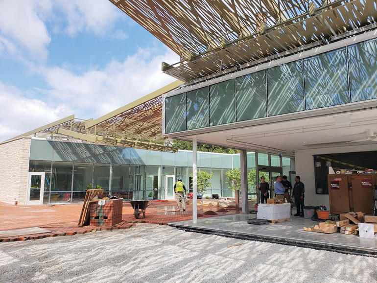 外面成为亭子的信息台,冠层在骨料基地上投射了叶状阴影,最终由渗透砖摊铺机覆盖。