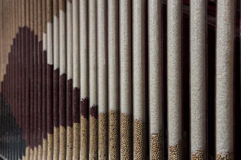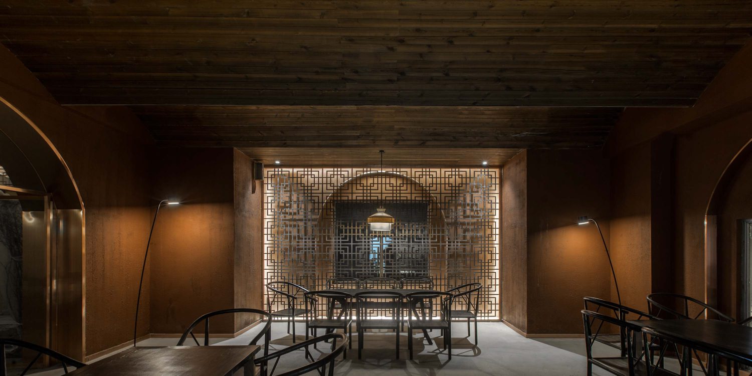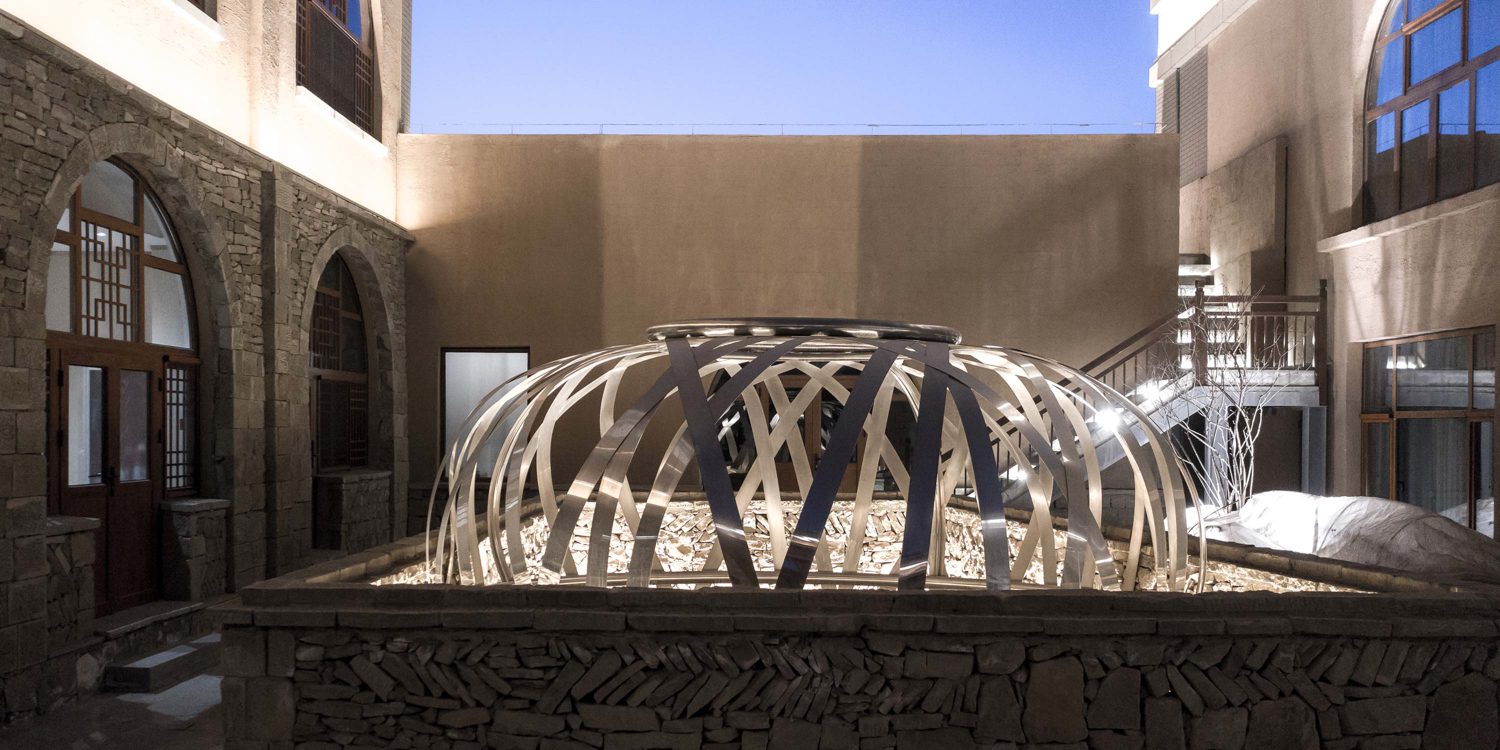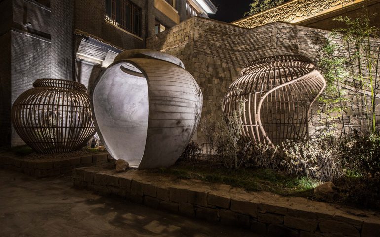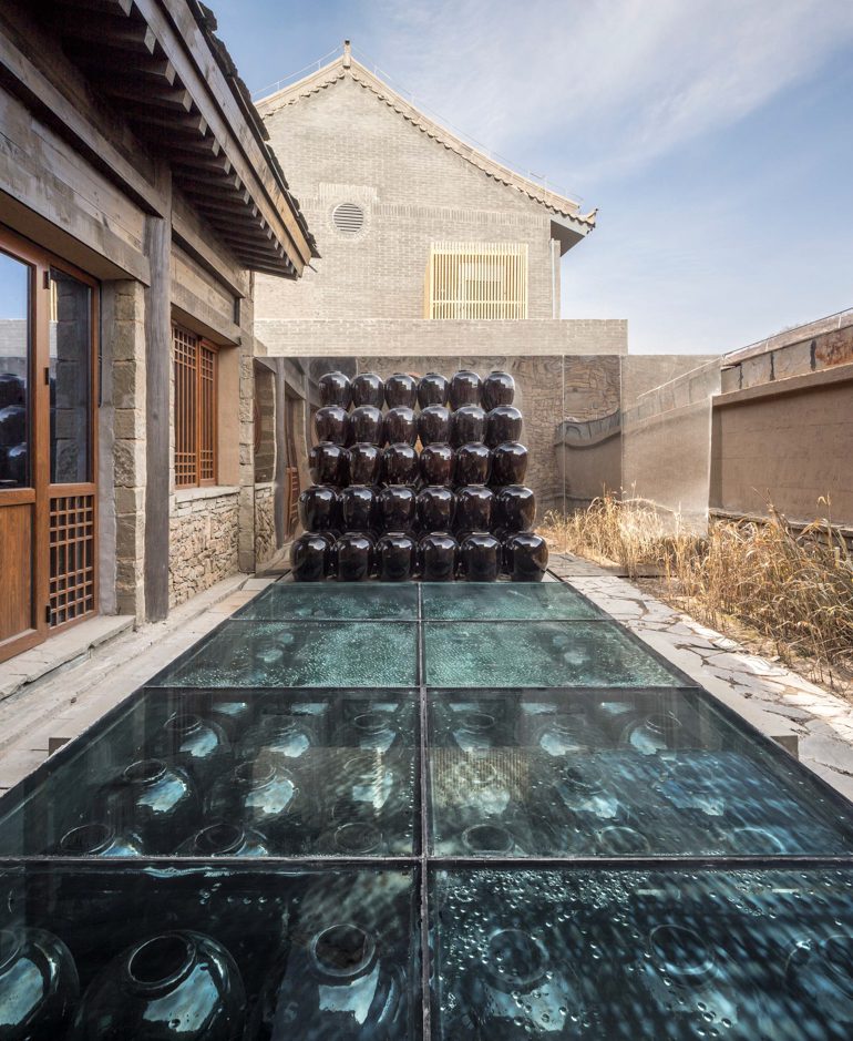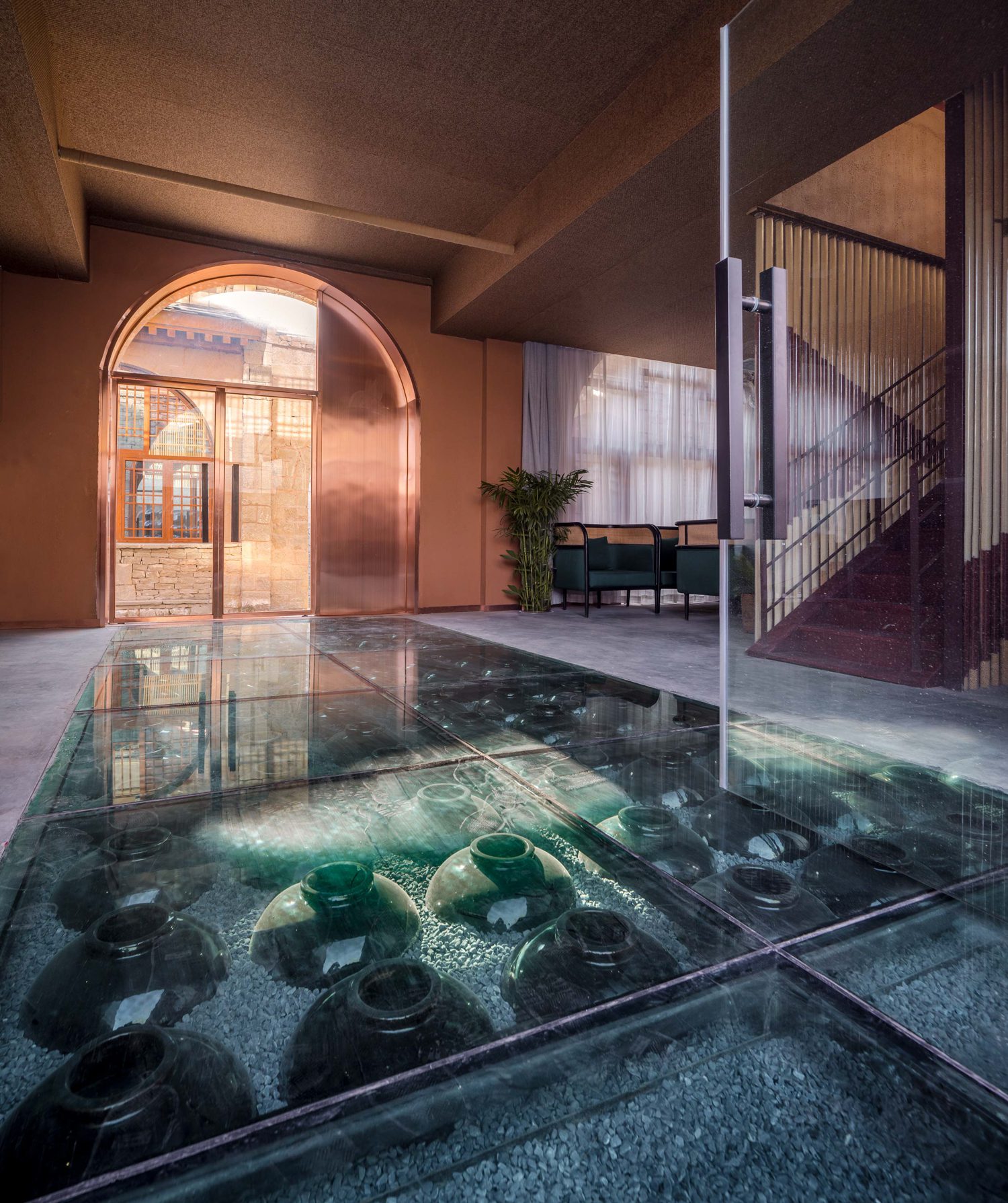通过一系列情感设计元素 中国延安商行济建工作坊封套宾客过程 制作区域传统酒山北珠或北山酒访问者在大厅里遇到装满谷粒种子制作酒的管子艺术安装物, 引导设计师Aurelien Chen与同事Wang Ke Yao合作项目,陶罐传统发酵过程使用,全过程提供寻路提示并显示外层水特征,体现子对玻璃变换中心院子还包括由交织金属板搭建的装置,提醒用篮子蒸馏酒