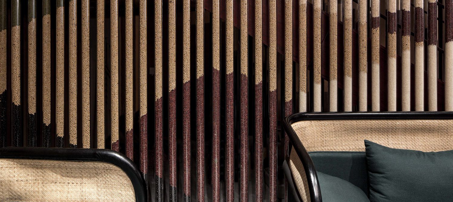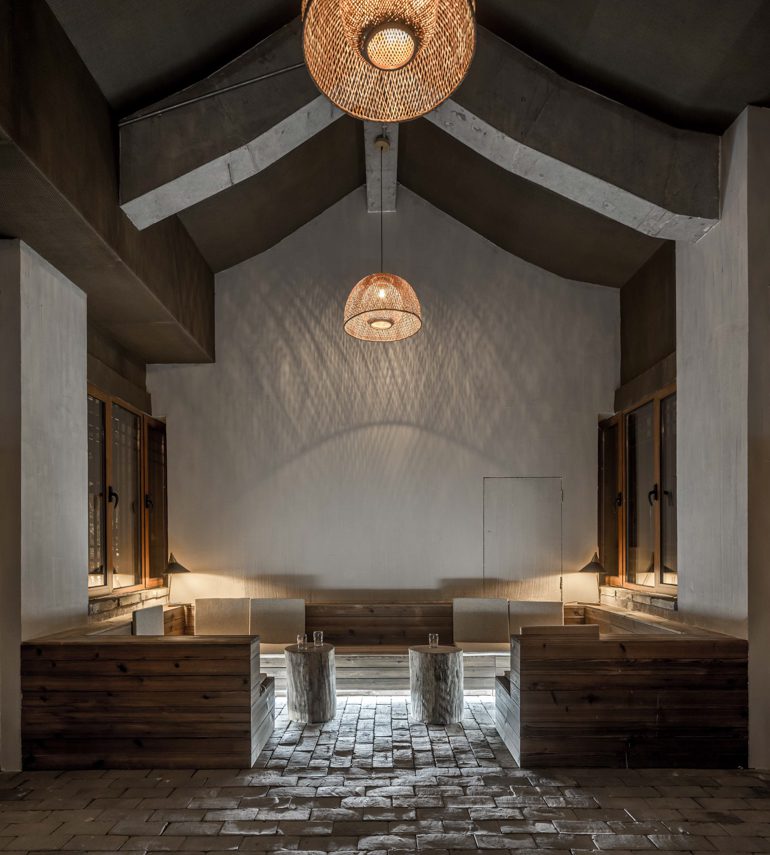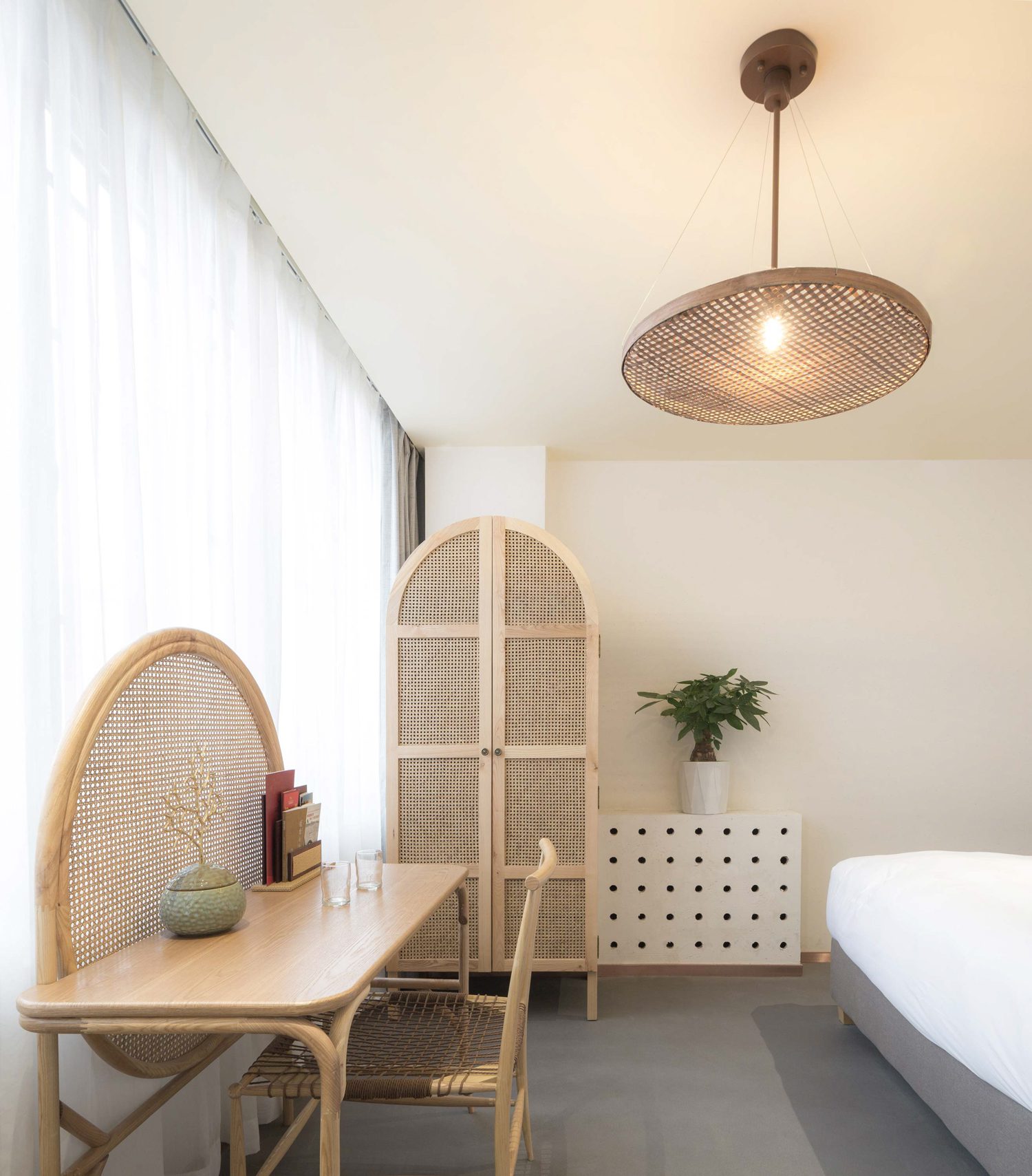 部分受谷物种子温暖颜色影响,酒店调色板与奶油中性者并发黑红色、黄黄色和棕色空间结构大都反映传统蒸馏厂和局部东市或“屋洞”,这些洞穴从山坡挖出或建自土和沙砖,”陈说客房涂上涂料加种子添加文艺,邀请访问者接触纹理和素材甚至是wicker装饰和编织布料全调用以记起酒制作过程使用的工具 Chen表示