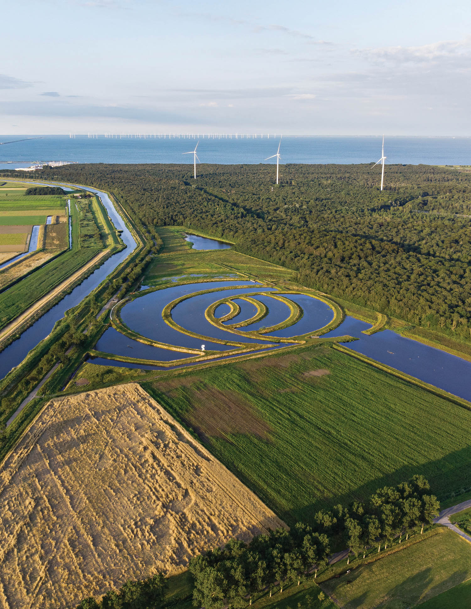 园艺师Pe Okx与生态学家Cor tenhaf合作访问者可爬上画面楼梯观摩地球工程,它波纹形式象征着生活在40英亩网站内并部分用于改善淡水和盐水间迁移的鱼的生命周期