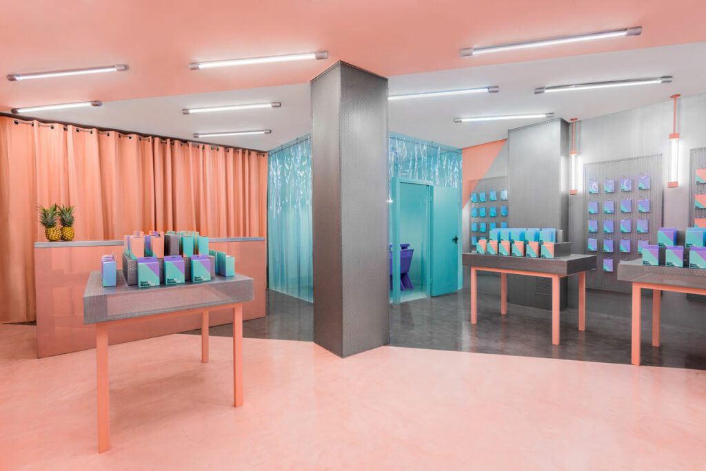 西班牙演播室位于Arthy Brera区第三位意大利链继续其前身游泳池美学,但四色调色板-黄色、粉色、绿色和蓝色-更适合复杂邻里使用,并用极光镜效完成某些天花板和墙面以唤起波浪包围的感觉